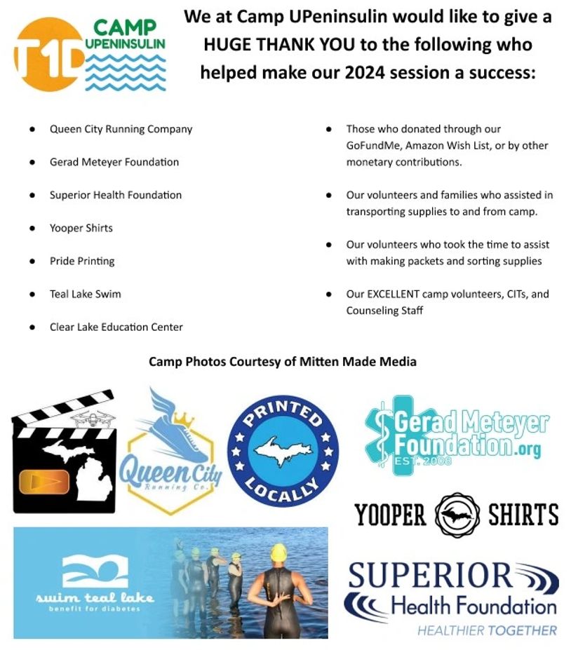 Please help Camp UPeninsulin in thanking the Gerad Meteyer Foundation for sponsoring our canoe and high-ropes adventures this summer! Their generosity has allowed us to continue our mission of providing a low cost camp that children with Type 1 Diabetes can attend regardless of financial status. Please visit GeradMeteyerFoundation.org to learn more about their organization.